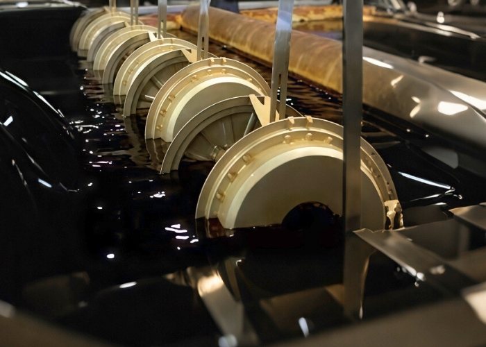 Once properly prepared, the aluminum is exposed to the chem film solution. During this stage, chromate compounds react with the aluminum surface to form a thin chromate conversion layer composed of aluminum oxides and chromium-based compounds. This layer provides corrosion protection while maintaining electrical conductivity.