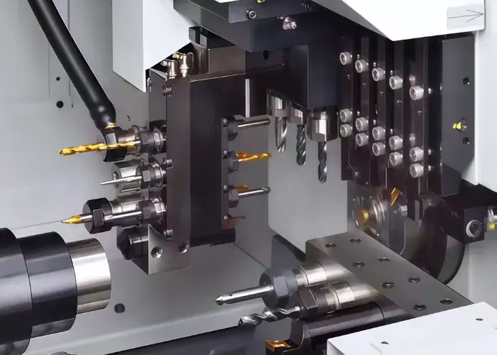 During machining, the tools are arranged around the working zone while the material advances in controlled increments. Since the stock is supported close to the cut, the machine can reduce bar whip, minimize vibration, and maintain better dimensional control than a standard lathe in similar slender-part applications. This helps improve roundness, concentricity, and repeatability, especially on parts with narrow diameters and demanding tolerance requirements.