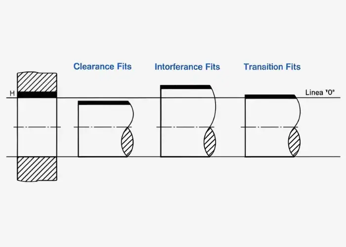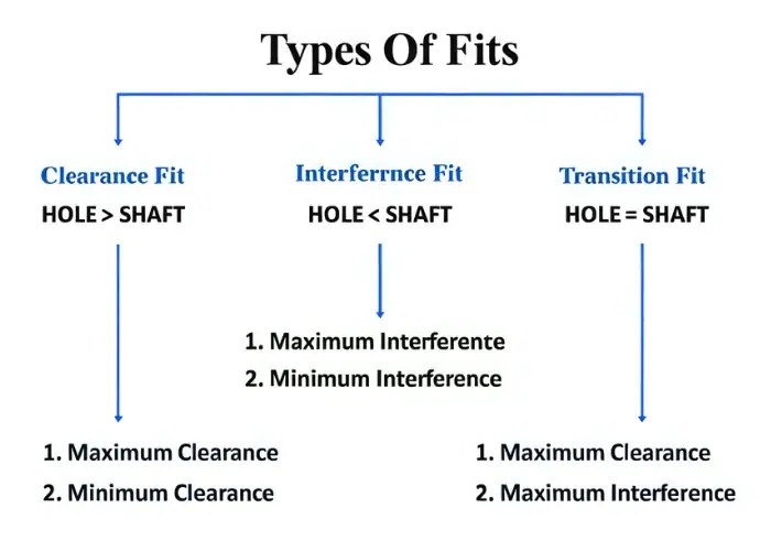 The main types of fits are clearance fit, interference fit, and transition fit. These three types describe whether the shaft is always smaller than the hole, always larger than the hole, or may be slightly smaller or larger depending on the tolerance zone.